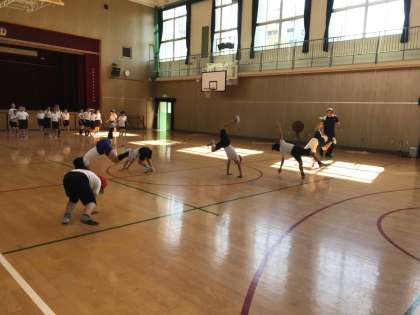 『リズムランニング』では、学習してきた側方倒立回転をリズムに合わせて。