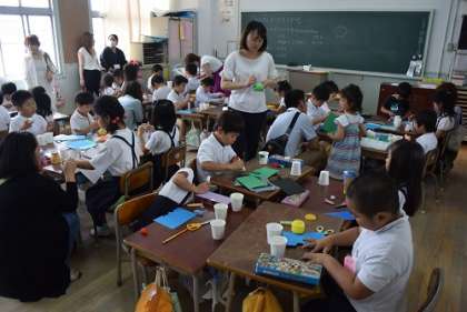 2年生は2時間目生活科で「おもちゃづくり」をおこないました。それぞれのクラスで作るものは違いましたが、みんな集中して作業をしていました。できあがるとニコニコ笑顔で「できたー!」と言っていました。カエルのおもちゃはよく跳んでいましたね。