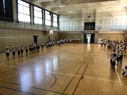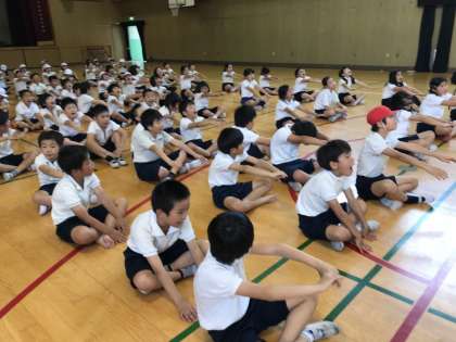 ほんの少しの時間も無駄にできないと、3・4年生で取り組む『リズム水泳』の講習会を合同体育でしました。