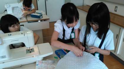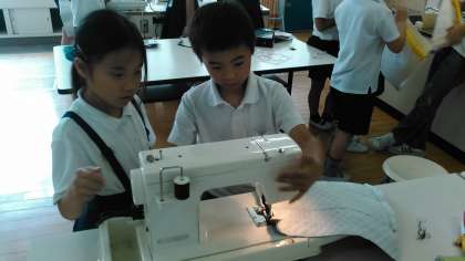 1か所縫い終わった後、一緒にミシンを使う友だちと目を合わせ「ニコッ!」
