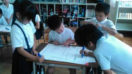 ほかの学年の友だちと一緒にポスターを描くみんな。
