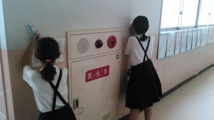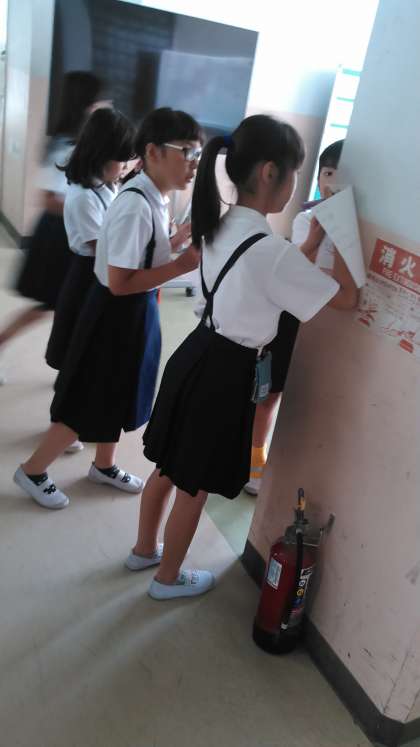 今日は『学校にはどんな消防設備があるのか』を調べて校内配置図に書き込んでいきました。北校舎の廊下だけでたくさんの消火器があることに驚き、ほとんどのクラスにバケツを置いて『防火』していることに気づきました。
