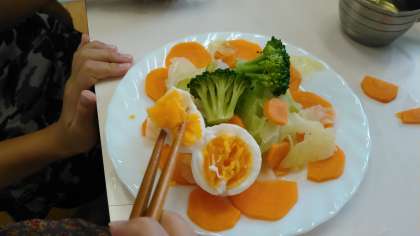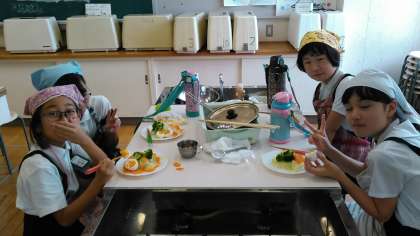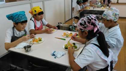 みんなで協力してキャベツを切り、ニンジンを切り。