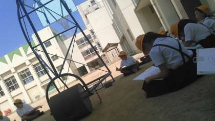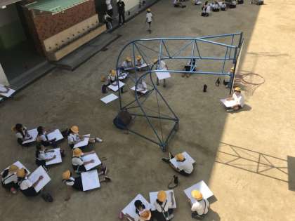 運動場に画板を持った5年生がバスケットゴールの周りで絵を描いています。