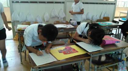 友だちのがんばりや工夫を見つけて感想を描いていく「4年生美術館」を開きました。