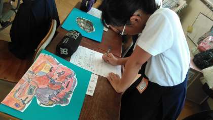 一般公開は2学期を予定していますが、友だちの絵の工夫しているところや、自分が『素敵だな』と思ったところを見つけて書きあっていきました。