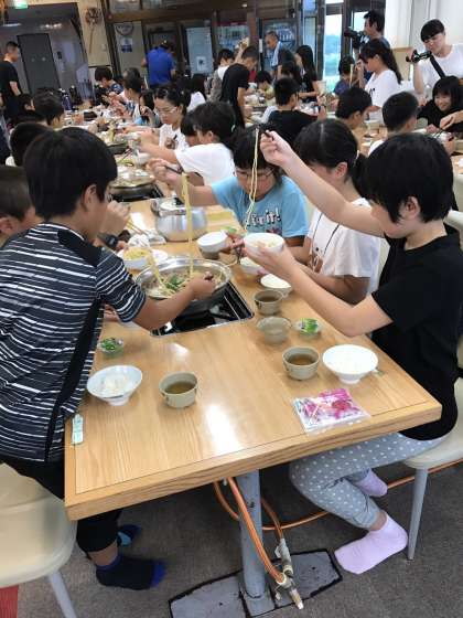 いよいよ夕食です。たくさん活動したのでお腹もペコペコです。メニューは「鴨鍋」です。