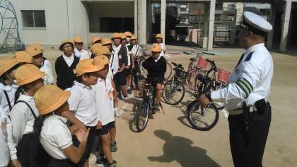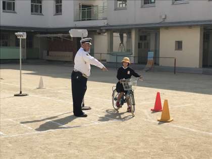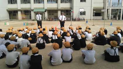 今日は対象警察からゲストティーチャーを迎えて交通安全教室を全学年で行いました。