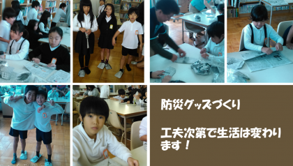 そして、防災グッズのブースでは、『自然災害などを被災し、不自由な生活の中でどのような工夫をすれば少しでも便利な暮らしになるだろう』、『工夫次第で心も豊かになる』ということをテーマに学びを深めました。