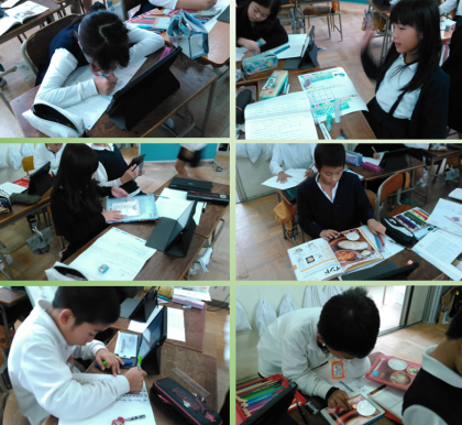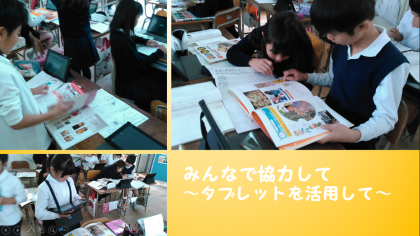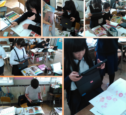 図書館にある本をみんなで共有するためにまとめたいページをタブレットで撮影し、まとめていきます。