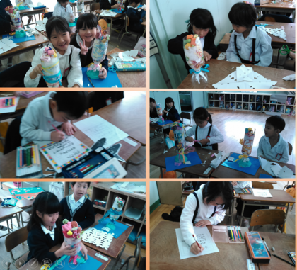 2時間目。1年生の教室に行くとパフェを完成させようと取り組んでいる人。作品にタイトルやどんなパフェなのか説明を書く人。説明を書いている紙をきれいに色鉛筆で塗って行く人。