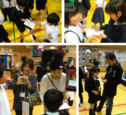 でも、何人かがその緊張を乗り越え、自分の作品を説明し、サインをもらい始めたり、おうちの方が「どんなことを工夫したん?どんなことがんばったん?」と聞いてくださったり。
