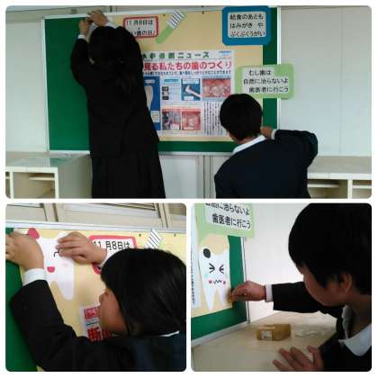 昼休みの保健室前の掲示板で作業をしている環境委員の6年生を見つけました。