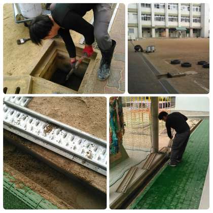 そんな中、運動場の側溝につまっていた砂を書き出す作業を「プロ」がしてくれました。知らない間に運動場から流れ出て側溝に流れて行った砂。