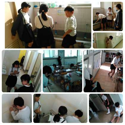 今日は6個所の割り当てがある4年生の掃除場所「教室」「教室横トイレ」「手洗い場とロッカー」を【体育館】【パソコン室】【体育館トイレ】の担当の人が見に行きました。