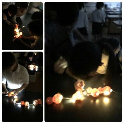 6時間目に理科室の暗幕を閉めて真っ暗にして二度目のひょうたんランプ点灯式をしました。