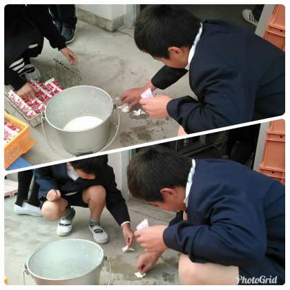 その姿を見て、空の牛乳パックを片付けていた4年生が手伝います。