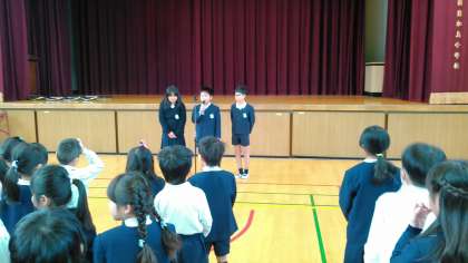 朝会で環境委員会の人たちが、今回の睡眠調べで南恩のみんなが書いたカードをまとめ、分析した結果を発表してくれました。