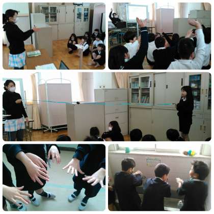 今回の保健の学習は『手洗いうがいの大切さ』と『咳やくしゃみでウイルスなどか飛散する距離』を学びました。