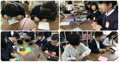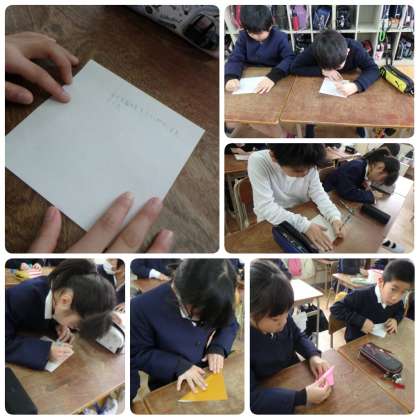鶴作りの一歩目の一枚目に自分の名前と『平和をつくるために自分がすること』を折り紙の裏に忍ばせました。