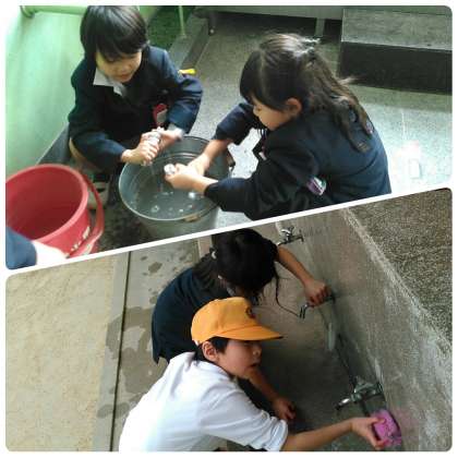 雑巾をバケツの水で洗っているのも一年生の二人です。
