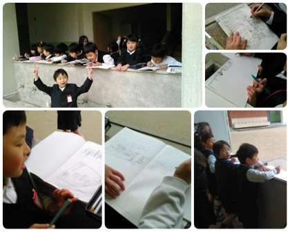 パソコン室横の階段の前にたくさんの一年生が自由帳を片手に集まっていました。