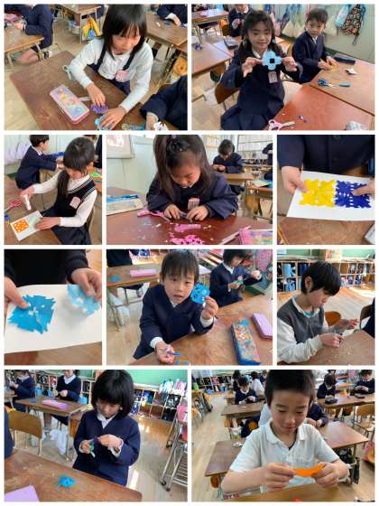 2年生が折り紙を半分に折って、ハサミを入れます。
