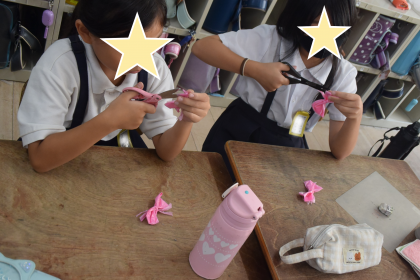 まずはポンポン作り。少し苦戦していましたが、スズランテープを細かく割いて、丸く形作っていきました。可愛い作品になりそうです!