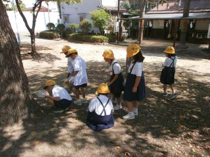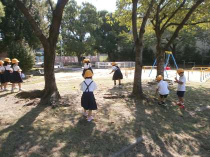 秋探しに、天満公園に行きました。赤や茶、黄色と色とりどりの葉っぱを見つけて、子どもたちは大はしゃぎでした。