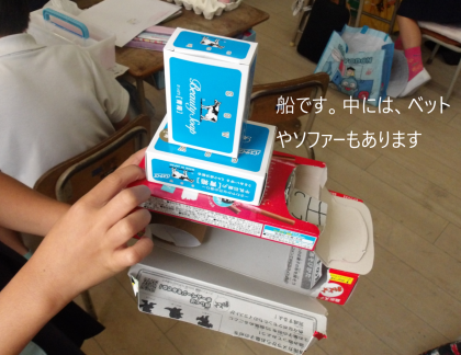 家から持ってきた空き箱を使って、お家や乗り物を作りました。