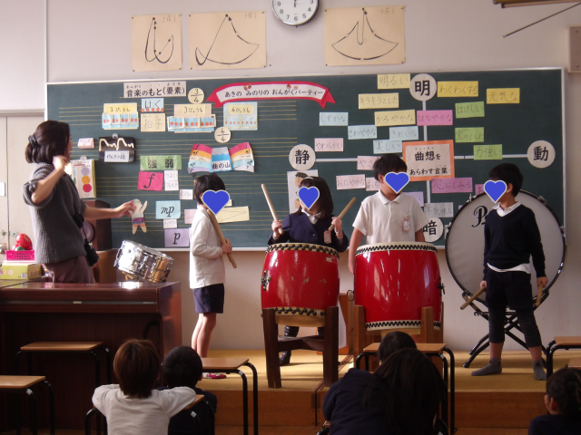 その流れで、和太鼓を打ちました。音やリズムを、声で表してから打ちました。