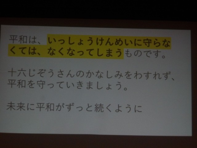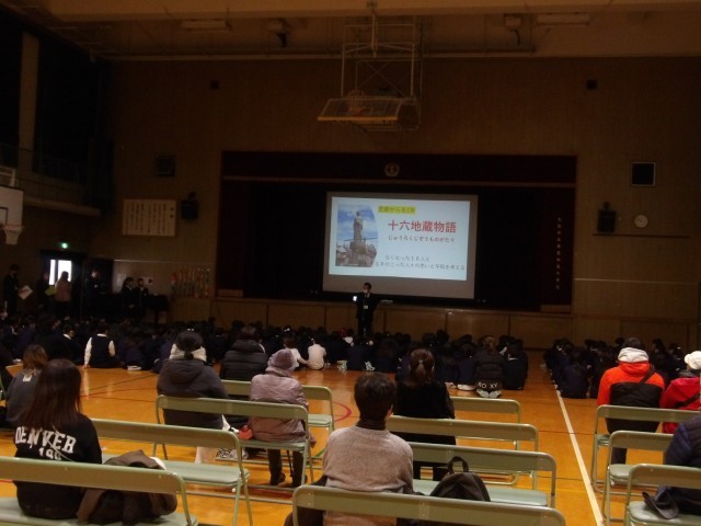 十六地蔵記念日集会を行いました。今年度は、十六地蔵にまつわる話を保護者や地域の方々により知ってほしいという思いから、地域の方々の参加も呼びかけさせていただきました。お忙しい中、来校してくださった皆様、ありがとうございました。子どもと大人、たくさんの人たちが一緒になって、亡くなった16人の子どもを偲ぶとともに、戦争について考え、平和を願うことができた、かけがえのない時間でした。未来がよりあたたかいものになるよう、これからも南恩加島から子どもたちと、そして皆様と共に平和への思いを発信していきたいです。