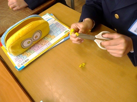 5年生は理科で花のつくりについて学習しています。校庭のアブラナの花を実際に使って、花びらの数やおしべめしべの数を学習していました。グループで小さな花一つ一つに分け、観察しています。「ほんもの」を使った学習は子どもたちの興味関心を高めていました。