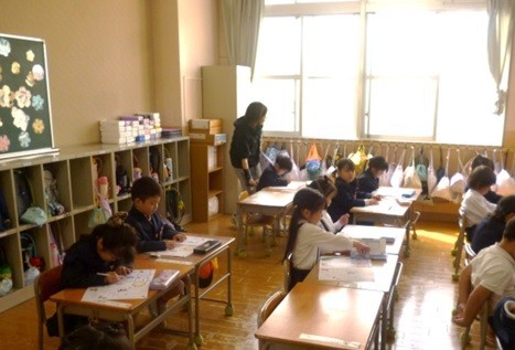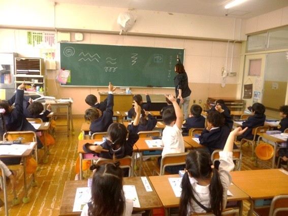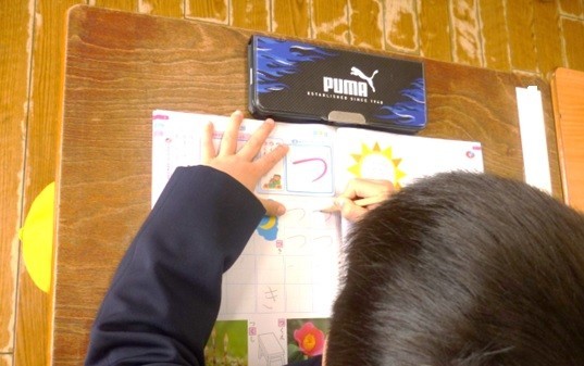 1年生は国語でひらがなの学習が始まりました。はじめてのひらがなは、一筆でかける文字から学習します。「つ」の学習をしました。先生が「まずは、ゆびの鉛筆でおそらにかくよ。」と言って手を上にあげると、子どもたちも手を上にあげてつの文字を書きました。それからゆっくりていねいに、ノートになぞり書きをしました。