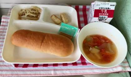 今日の給食は、「いかてんぷら、フレッシュトマトのスープ煮、サワーソテー、コッペパン、りんごジャム、牛乳」です。