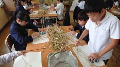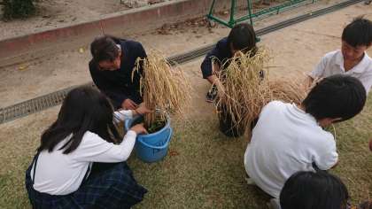 脱穀は、穂を茶わんで押さえて、もみを稲から外していく作業です。一粒も無駄にしないよう、気をつけて作業していました。