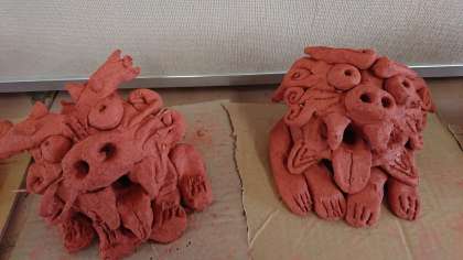 図画工作科の学習で「シーサーづくり」をしました。魔除けの意味を持つシーサーですが、強そうなシーサーや、かわいいシーサーなど、子どもたちは思い思いのシーサーを作りました。