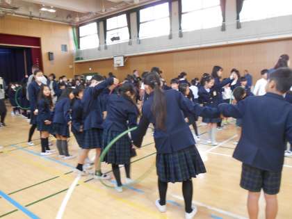 たて割り班で、「フラフープリレー」を楽しんでいました。