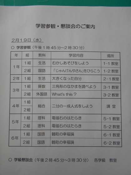 2/18 明日は、学習参観・・・ 公開日 2020/02/18 更新日 2020/02/18 その他 今年度最後の「学習参観・懇談会」です。 お忙しい折とは思いますが、子どもたちのがんばりを見に来てください! いいね(0)