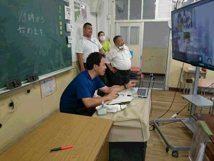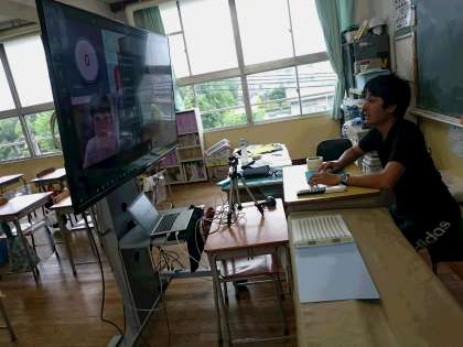 時間になると、学校の画面に子どもたちの顔が映り、担任を交えて話すことができました。