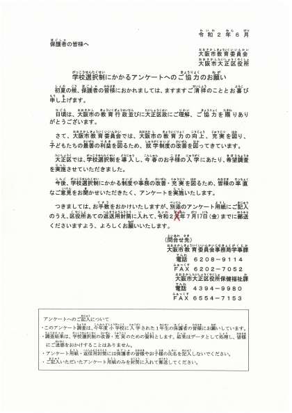 先週、大正区役所より学校を通じて配布いたしました「学校選択制にかかるアンケートへのご協力のお願い」のプリントに、一部訂正がありました。