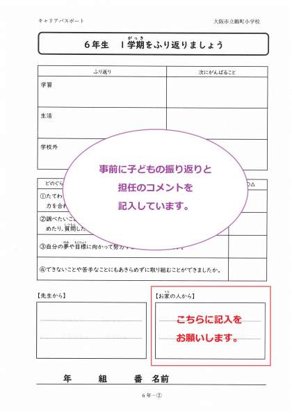 お子さんへの励ましのコメントを記入していただき、1学期中に学校まで返却をお願いします。