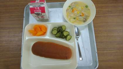 今日の献立 公開日 2020/08/04 更新日 2020/08/04 その他 ・黒糖パン ・牛乳 ・コーンクリームシチュー ・きゅうりのバジル風味サラダ ・みかん(缶) きゅうりにはバジルやワインビネガーが使われており、おしゃれな味がします。 いいね(0)