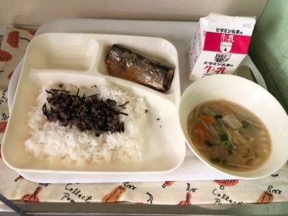今日の給食は、ごはん、さんまのみぞれかけ、みそ汁、牛ひじきそぼろ、牛乳です。