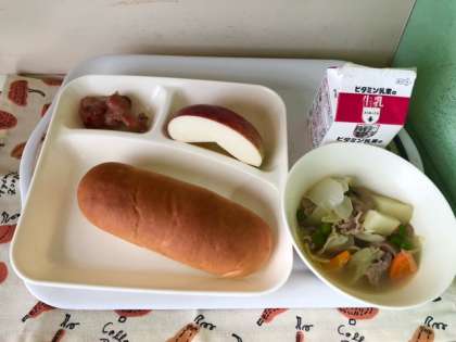 ・鶏肉のガーリック焼き ・豚肉と野菜のスープ煮 ・りんご ・おさつパン ・牛乳 りんごが大人気です!