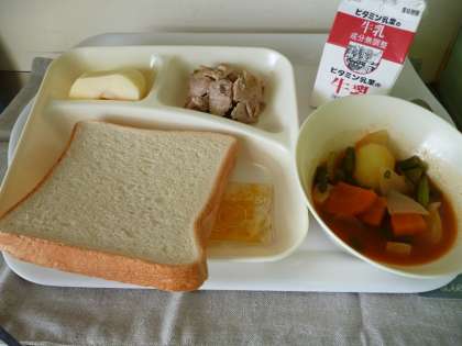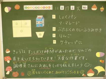 りんごはシャキシャキ。甘みと酸味のバランスがよく、一つ一つ丁寧に皮を剥いてくださった調理員さんにも頭が下がります。