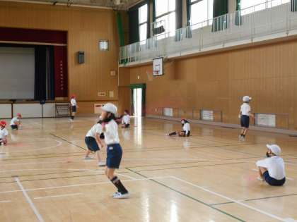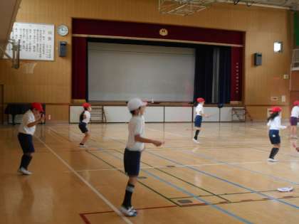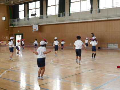 体育館では、「なわとびを使ったゲーム」です。