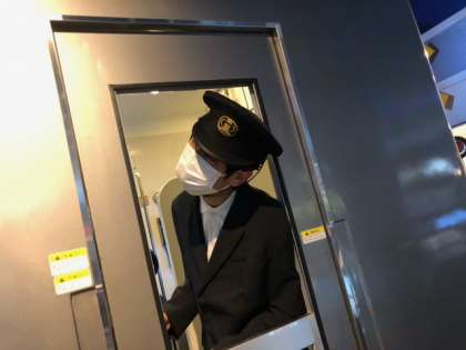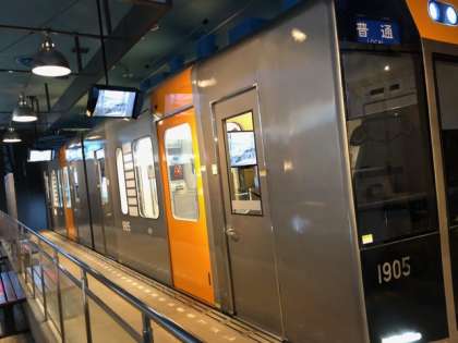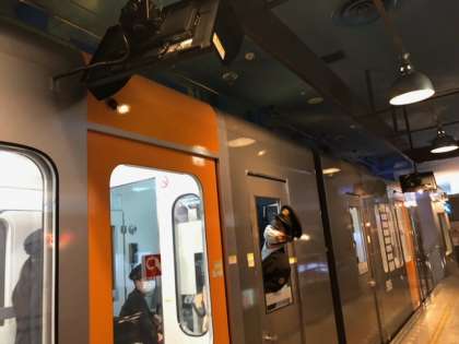 電車の車掌を、体験をしています。制服姿が良く似合っています。