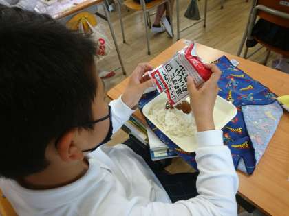 ヒートレスカレー6年 公開日 2021/05/20 更新日 2021/05/20 その他 6年生は、本当なら今日修学旅行に出発する予定でした。 延期となったことで、今日の給食は「ヒートレスカレー」になりました。 はじめは「温かくないカレーなんて嫌やー」と言っていた子もいましたが、食べてみると、これが意外といけるんです。野菜もしっかり入っています。 余ったルーをおかわりしている子もいましたよ。 いいね(0)