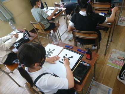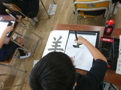 毛筆で「羊」を書きました。 画の長さや間隔に気をつけながら、集中して書けていました。